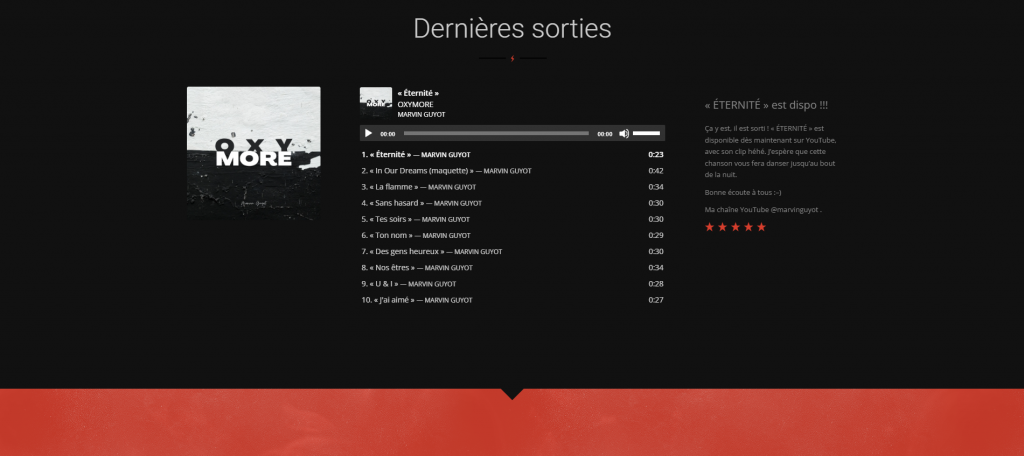 • Accroche visuelle : Le design du lecteur est intégré à une section de fond noir avec des accents rouges et blancs, ce qui rend l’ensemble cohérent avec le reste du design du site.
